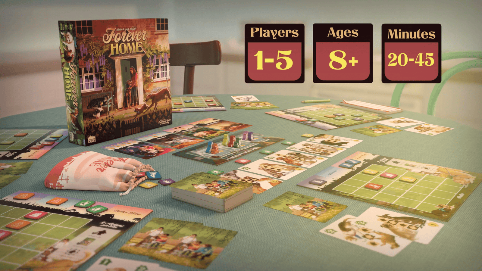 Featuring quick and simple turns; a unique solo mode; and a second advanced side to the player board, Forever Home is a replayable, easy-to-love abstract game.