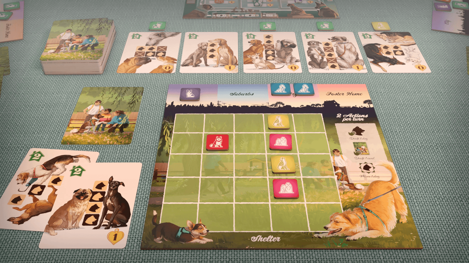 Using a combination of tile placement, set collection, and drafting, you and your friends take on the role of shelter workers. Take it in turns to bring dogs into your shelter, complete training cards, and match pups up with new families. You’ll be competing for valuable shelter commendations - as well as gaining reputation for training and rehoming the dogs in your care. At the end of the game, the shelter worker with the most reputation wins!